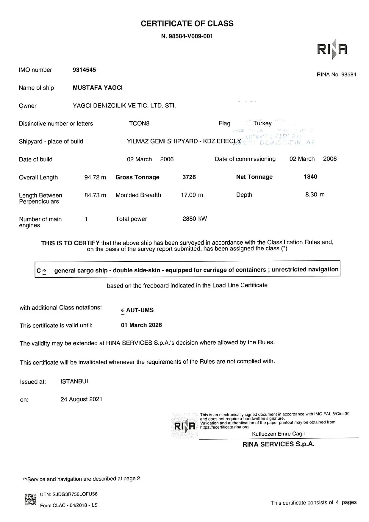 | IMO NO / CALL SIGN | 9314545 – TCON 8 |